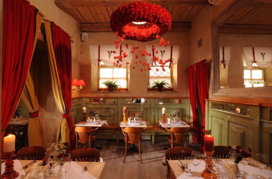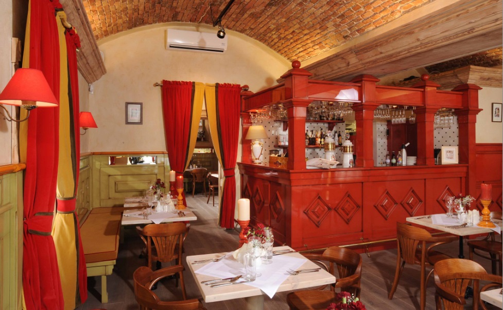 Kompleksowa realizacja wyposażenia w meble restauracji mieszczącej się na starym rynku w Krakowie. W zakres dostawy wchodziły: ławy z litego drewna tapicerowane wykonane wg. indywidualnego projektu, lada barowa z litego drewna oraz lakierowanej płyty mdf, stoły wykonane z litego drewna brzozowego, stoły na podstawach żeliwnych stylizowanych 06/100 z blatami z litego drewna brzozowego, krzesła z drewna giętego 08/B-6023.
