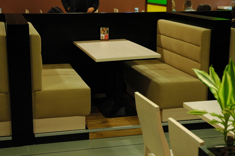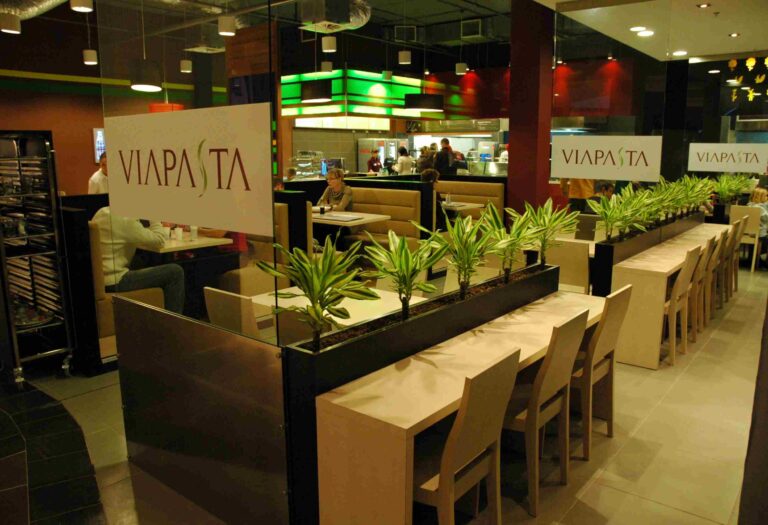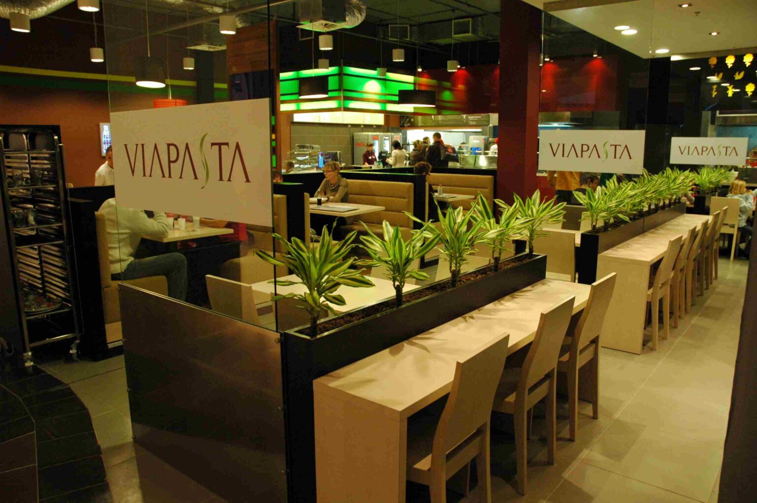 Dostarczyliśmy i zamontowaliśmy meble do wyposażenia restauracji Viapasta w CH Alfa w Białymstoku. Zakres prac obejmował: meble na zamówienie (zabudowa lady barowej, stoły na podstawach stołowych 02/Bals-44 z blatami z laminatu HPL, krzesła 08/A-0448, hokery 03/4446, loże tapicerowane w formie boxów.