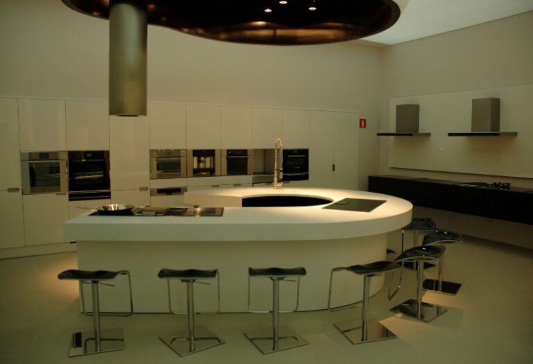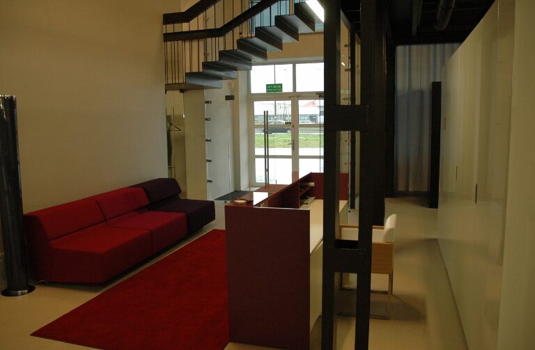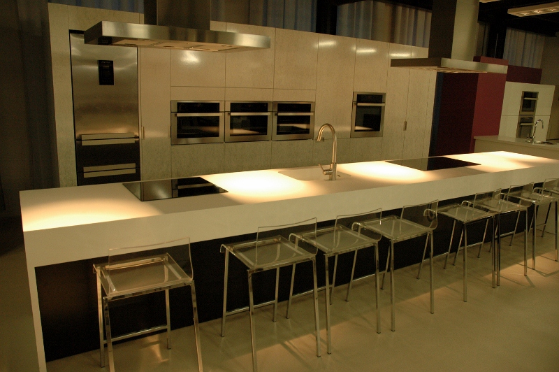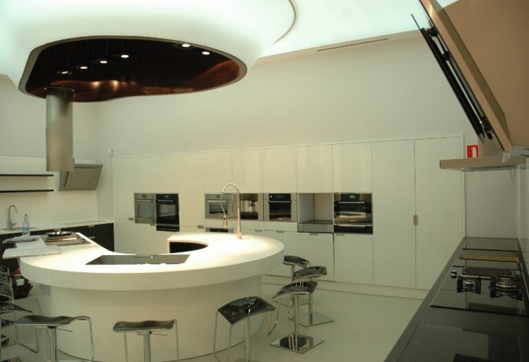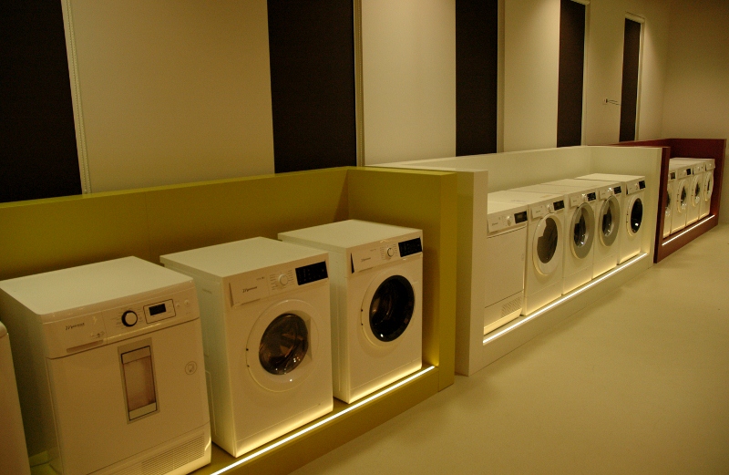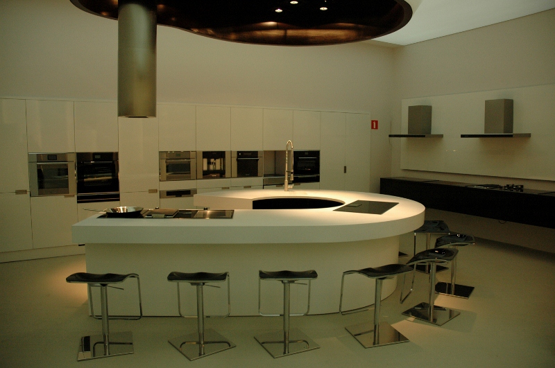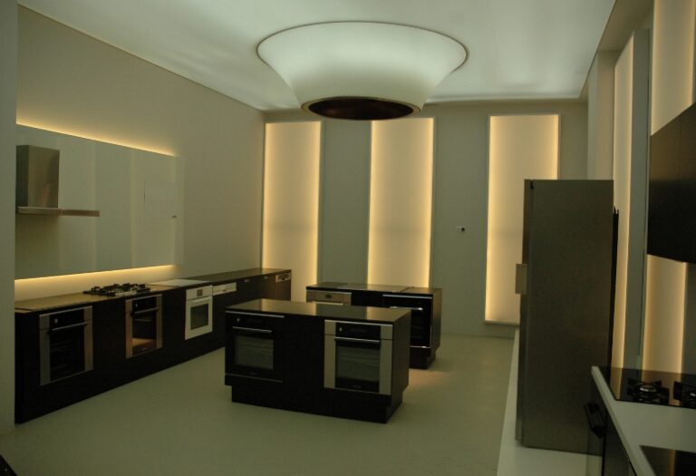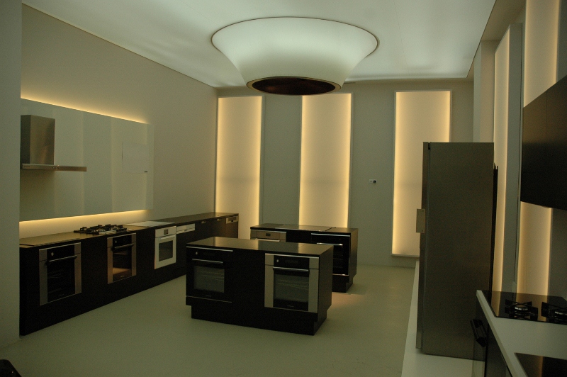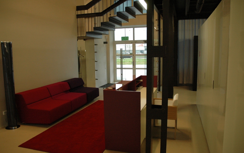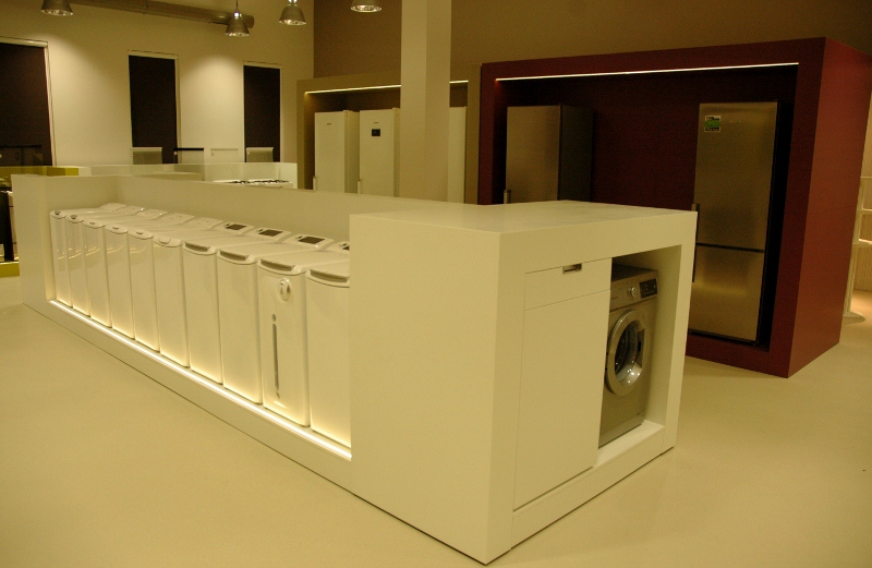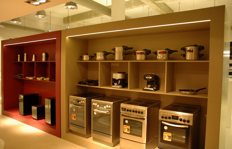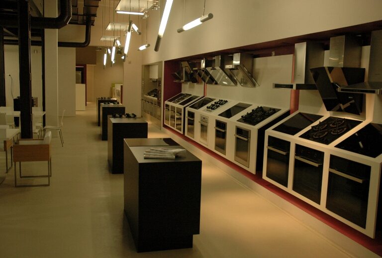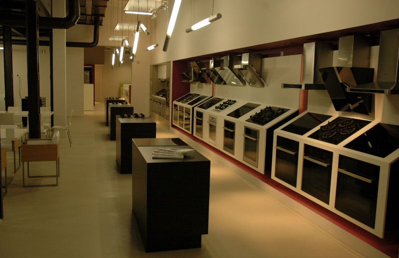 Najtrudniejsze zadanie, przed jakim stanęła firma – kompleksowe wyposażenie „pod klucz” salonu wystawienniczego firmy Fagor-Mastercook. Elementy wyposażenia wnętrz dostarczone i zamontowane przez firmę: Nietypowe zabudowy meblowe – jako ekspozytory sprzętu AGD – wykonane z płyty laminowanej hpl oraz płyty mdf lakierowanej, z blatami kamiennymi, z laminatu hpl i Corianu. Ekspozytor na drobny sprzęt AGD wykonany w formie półek z płyty mdf lakierowanej na stelażu stalowym lakierowanym proszkowo. Zabudowy okien: w formie zasłon, rolet i obitych materiałem oraz podświetlonych ledami ram drewnianych. Obrotowy wieszak na ubrania – wykonany ze stali lakierowanej proszkowo. Meble standardowe: fotele tapicerowane skórą naturalną 03/740, hokery z siedziskiem z metakrylu 03/570 i 03/1172, stoły z blatem laminowanym hpl na podstawie ze stali nierdzewnej 02/Bax-56, sofa tapicerowana Magnetic firmy Iker, lampa stojąca firmy Casamania, meble do sali konferencyjnej firmy BN Office Solution. Zlewozmywaki i baterie kuchenne firmy Kludi oraz Blanco. Zakres prac obejmował również wykonanie podłączeń elektrycznych i hydraulicznych.
